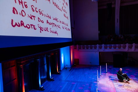 Finally, a heartfelt thank you to everyone who came to the Diaries of Note launch at Cadogan Hall on Monday. It was a joy to spend the evening talking about the value and power of diaries, about cryptic masturbation tallies, about Orwell’s wartime egg counts, about the amusing juxtaposition of the mundane and the momentous, and everything else. I’m so grateful to our brilliant readers—Louise Brealey, Matt Berry, Helen Fielding, Sir Tony Robinson, and Ferdinand Kingsley—for bringing various diarists’ voices to life with such warmth and wit. It really was a fantastic night.