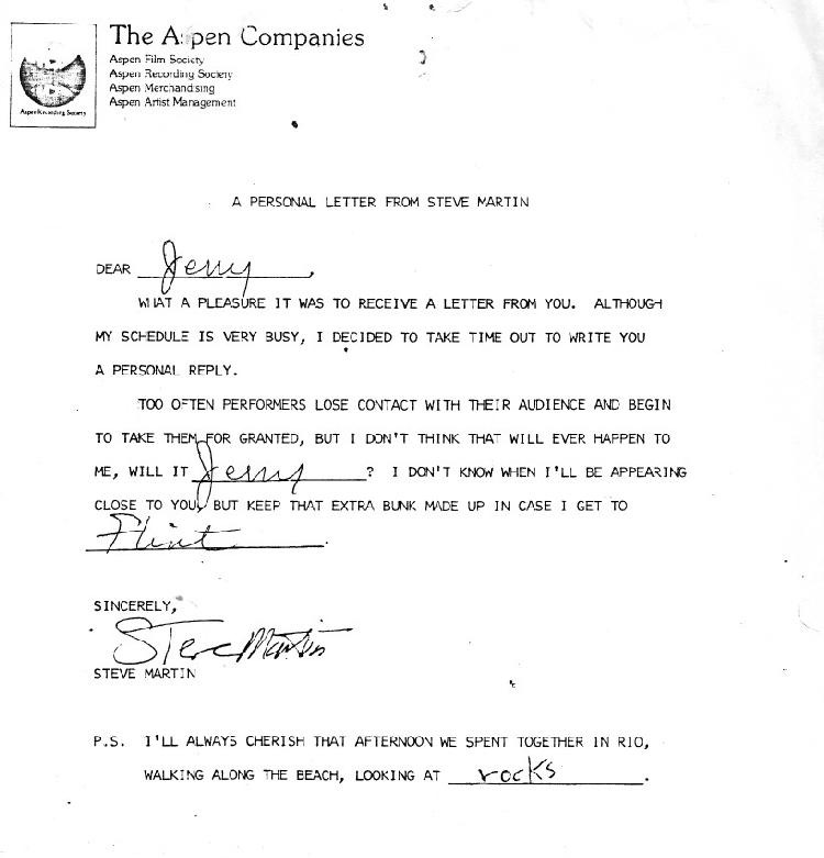 It’s Steve Martin’s birthday, so I’m sending you a classic that features in the first ever Letters of Note book. Eternal thanks to both Steve Martin and Jerry Carlson for allowing it.