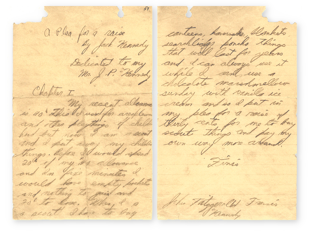 Late-1927, having just become a Boy Scout and acutely aware that his weekly allowance wouldn’t cover the costs of such a lifestyle, 10-year-old John F. Kennedy approached his father and asked for a raise of 30¢. Keen to teach the future President a quick business lesson, Kennedy Sr. immediately told him that, unless his plea was put in writing, it wouldn’t be heard.