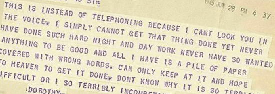THIS IS INSTEAD OF TELEPHONING BECAUSE I CANT LOOK YOU IN THE VOICE. I SIMPLY CANNOT GET THAT THING DONE YET NEVER HAVE DONE SUCH HARD NIGHT AND DAY WORK NEVER HAVE SO WANTED ANYTHING TO BE GOOD AND ALL I HAVE IS A PILE OF PAPER COVERED WITH WRONG WORDS. CAN ONLY KEEP AT IT AND HOPE TO HEAVEN TO GET IT DONE. DONT KNOW WHY IT IS SO TERRIBLY DIFFICULT OR I SO TERRIBLY INCOMPETANT.