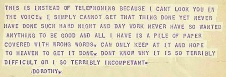 THIS IS INSTEAD OF TELEPHONING BECAUSE I CANT LOOK YOU IN THE VOICE. I SIMPLY CANNOT GET THAT THING DONE YET NEVER HAVE DONE SUCH HARD NIGHT AND DAY WORK NEVER HAVE SO WANTED ANYTHING TO BE GOOD AND ALL I HAVE IS A PILE OF PAPER COVERED WITH WRONG WORDS. CAN ONLY KEEP AT IT AND HOPE TO HEAVEN TO GET IT DONE. DONT KNOW WHY IT IS SO TERRIBLY DIFFICULT OR I SO TERRIBLY INCOMPETANT.