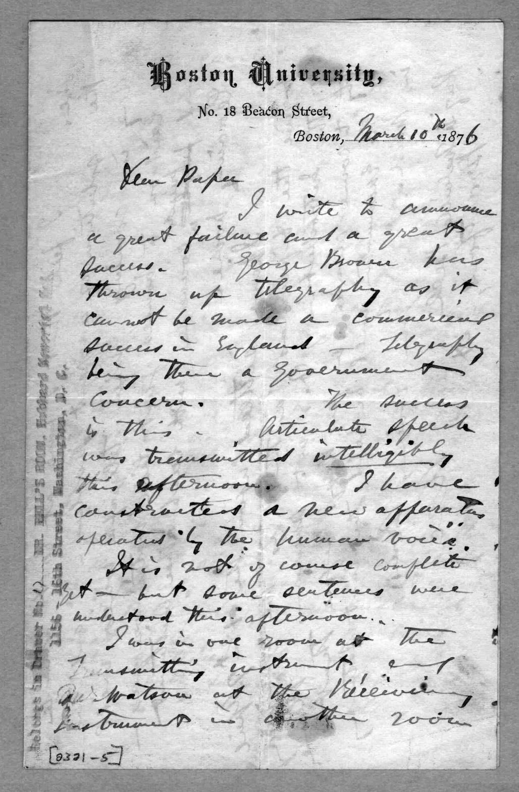 I write to announce a great failure and a great success. George Brown has thrown up telegraphy as it cannot be made a commercial success in England — Telegraphy being there a Government concern. The success is this. Articulate speech was transmitted intelligibly this afternoon. I have constructed a new apparatus operated by the human voice.