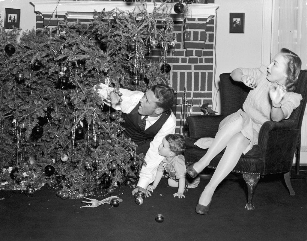 on christmas eve our photographer was due to take pictures of the whole family, and that morning i discovered that the christmas tree we were supposed to get had been overlooked and we had no tree; finally, about five o’clock, the man arrived with two miserable little trees and said that was all he had left, and we should cut the branches off one and tie them on the other and it would be fine. you should have seen those bedraggled old things.