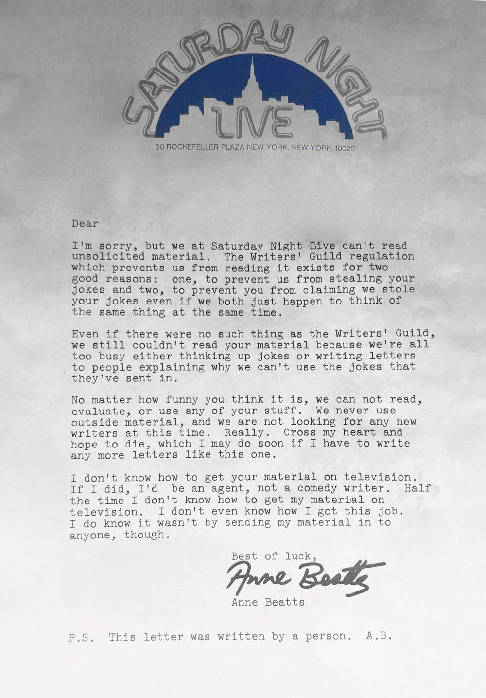 Since Saturday Night Live first aired fifty years ago, comedy writers have dreamed of seeing their jokes land on that legendary stage—delivered by the likes of John Belushi, Gilda Radner, Eddie Murphy, Tina Fey, or Bill Hader, to name just a few. With its unmatched influence, the show has long been flooded with unsolicited submissions from hopefuls convinced they have the next great sketch. But breaking in has never been that simple. This is just one of countless rejection letters fired off since 1975, in this case written in the early days by one of the show’s original writers, Anne Beatts.