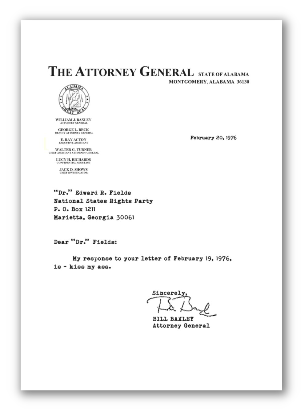 In 1970, shortly after being elected Attorney General of Alabama, 29-year-old Bill Baxley reopened the case of the 16th Street Church bombing, a racially motivated act of terrorism that resulted in the deaths of four African-American girls1 in 1963 and a fruitless investigation, which marked a turning point in the Civil Rights Movement. Baxley’s unwavering commitment to the case attracted much hostility, particularly from local Klansmen, and in 1976 he received a threatening letter of protest from white supremacist Edward R. Fields—founder of the National States’ Rights Party and “Grand Dragon” of the New Order Knights of the Ku Klux Klan—in which he was accused of reopening the case for tactical reasons. Baxley’s magnificent letter of reply, seen below, was both succinct and unambiguous.