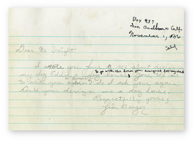 I wrote you June 19, 1956 about designing my dog Eddie a dog house to go with the house you designed for my dad. You told me to write you again in November so I ask you again, could you design me a dog house.
