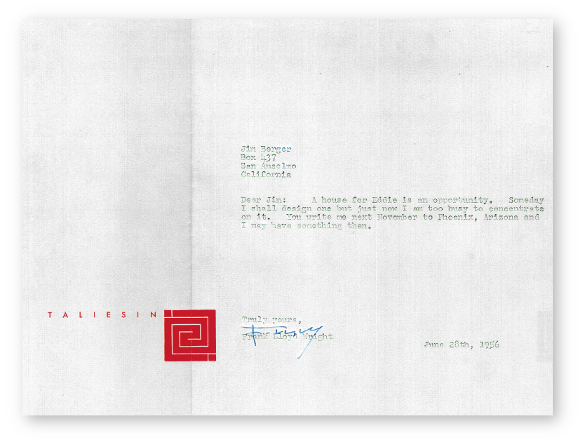 A house for Eddie is an opportunity. Someday I shall design one but just now I am too busy to concentrate on it. You write me next November to Phoenix, Arizona and I may have something then.