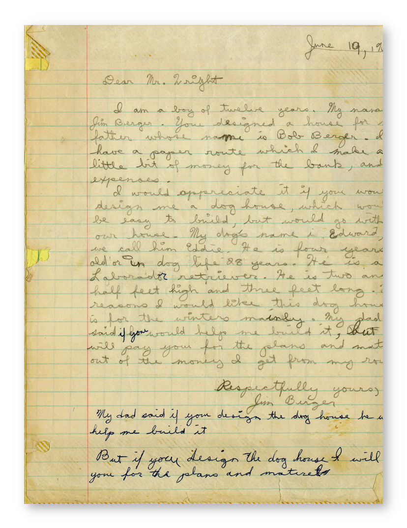 I am a boy of twelve years. My name is Jim Berger. You designed a house for my father whose name is Bob Berger. I have a paper route which I make a little bit of money for the bank, and for expenses.