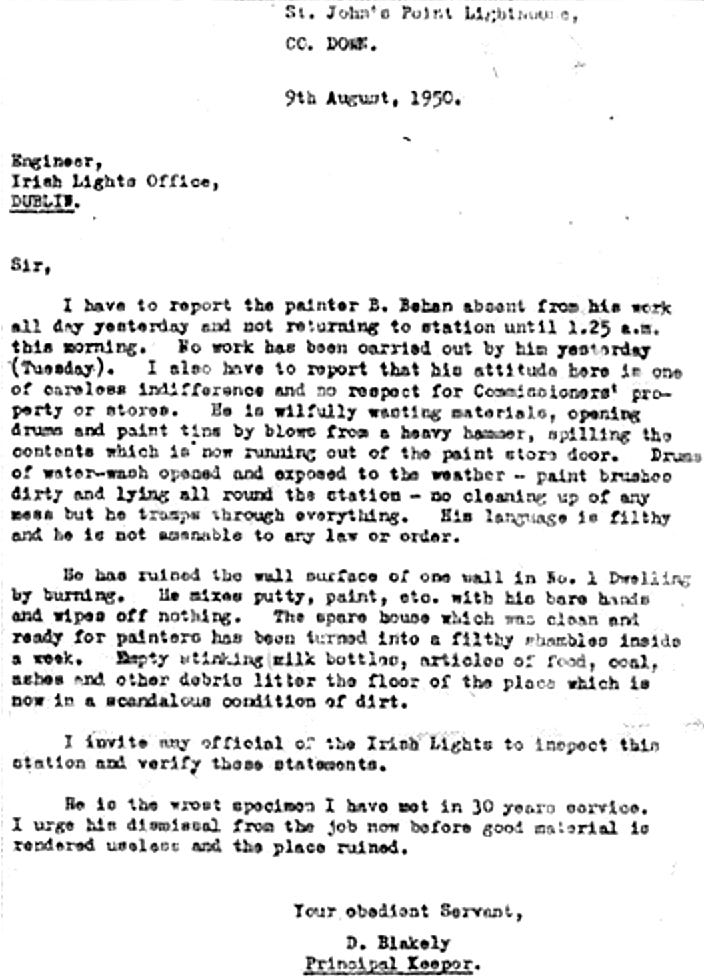 Before The Quare Fellow hit the stage, before Borstal Boy made him a household name, Brendan Behan was a house painter. Briefly. In 1950, the young Dublin-born writer was hired to paint the inside of St John’s Point Lighthouse in County Down—a task that proved entirely beyond him. A self-proclaimed “drinker with a writing problem,” Behan left behind more destruction than decoration. Paint was spilled, walls were somehow burned, and judging by the now-famous letter you are soon to read, at least one principal lighthouse keeper was pushed to breaking point.