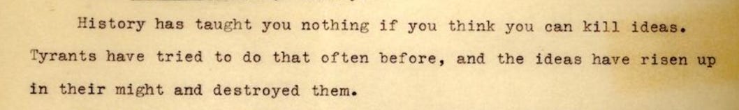 History has taught you nothing if you think you can kill ideas. Tyrants have tried to do that often before, and the ideas have risen up in their might and destroyed them.