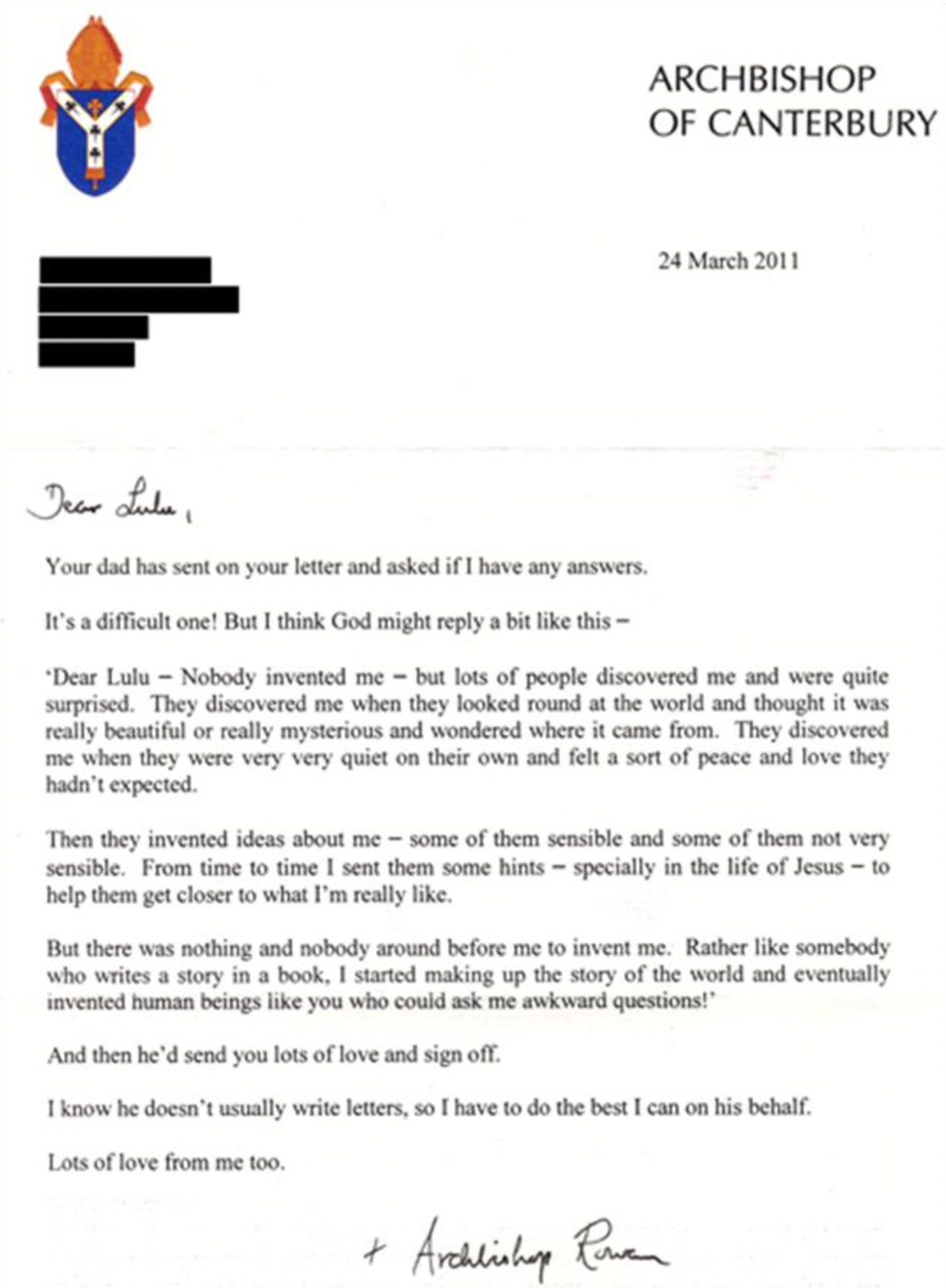 In 2011, journalist Alex Renton’s six-year-old daughter, Lulu, wrote a brief letter to God and tasked her father with ensuring that it reached the intended recipient. Unsure of how to deal with such a request, Alex, an atheist, sent copies of the letter to family members, Christian friends, the local Scottish Episcopal Church, the Church of Scotland, and the Scottish Catholic Church, all with varying and unsatisfactory degrees of success. It was only when he wrote to the Anglican Communion that he finally received a letter that so perfectly and gently answered his daughter’s question—her question being, “How did you get invented?” That reply, reprinted below, was written by Rowan Williams, then-Archbishop of Canterbury. Alex later recalled: