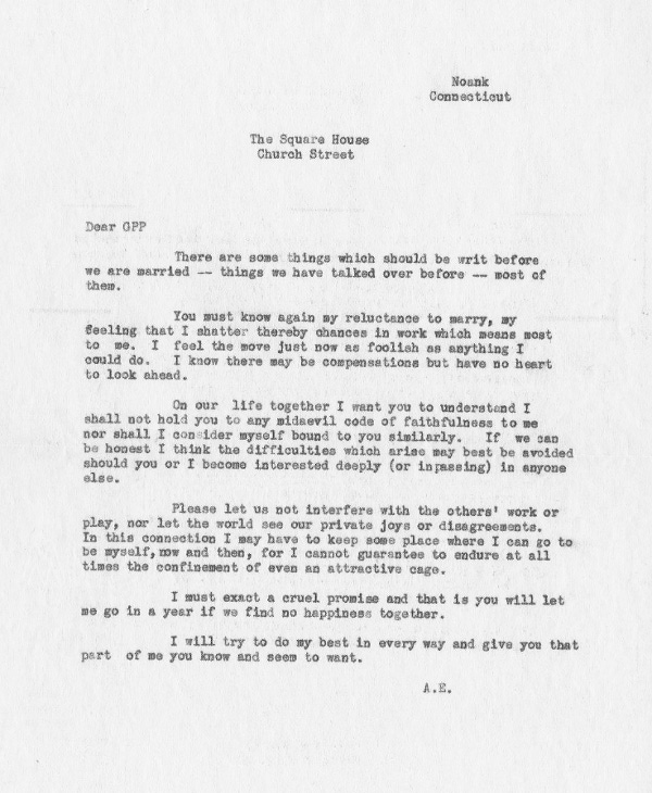 On our life together I want you to understand I shall not hold you to any midaevil code of faithfulness to me nor shall I consider myself bound to you similarly. If we can be honest I think the difficulties which arise may best be avoided should you or I become interested deeply (or in passing) in anyone else.