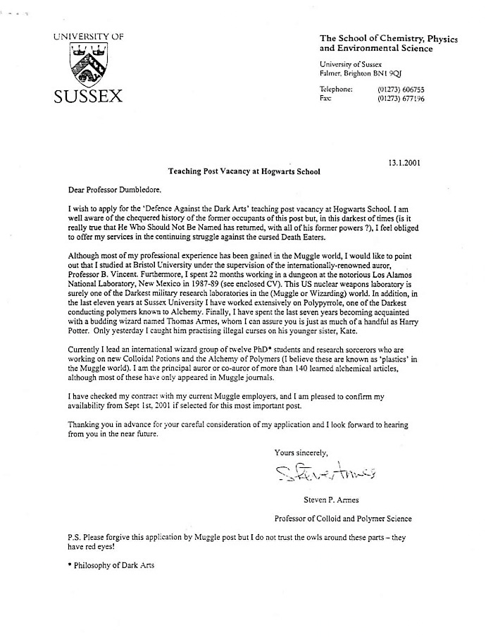 Steven Armes has an impressive CV—impressive enough, one would think, to secure a teaching job of his choosing. At the time of writing the following letter, he was (and indeed still is) Professor of Polymer and Colloid Chemistry at the University of Sheffield; before that, he had worked at the Los Alamos National Laboratory, one of the largest and most revered research institutions in the world. He has also authored hundreds of scientific papers, and in 2014 became a Fellow of the Royal Society for his pioneering contributions to science. In 2001, believing himself to be a perfect candidate despite his being a Muggle1, he applied for the post of Defence Against the Dark Arts Teacher at Hogwarts School of Witchcraft and Wizardry, the fictional institution made famous by J. K. Rowling’s Harry Potter book series. This is the application letter he sent to the Harry Potter offices, and the reply that soon arrived.