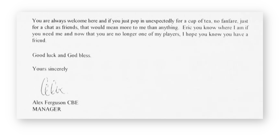 As I close this letter, I would like to hope that we will have a chat, a drink, or a meal together soon. I know the club has written to you about the forthcoming dinner and I hope you will manage it, but that is not the most important thing, for me it is to remind you how good a player you were for Manchester United and how grateful I am for the service you gave me. I will never forget that and I hope you won’t either.