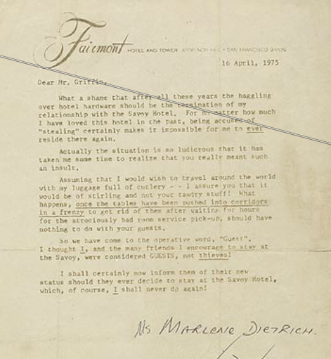 What a shame that after all these years the haggling over hotel hardware should be the termination of my relationship with the Savoy Hotel. For no matter how much I have loved this hotel in the past, being accused of “stealing” certainly makes it impossible for me to ever reside there again.