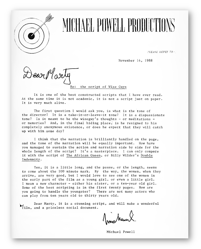 It was in 1975 that Martin Scorsese finally met his idol, Michael Powell, and embarked upon a fifteen year friendship that would see Powell—one half of The Archers and the renowned British filmmaker behind such movies as The Red Shoes and The Life and Death of Colonel Blimp—repeatedly offering invaluable advice and feedback to the American director. A perfect example: in 1988, after reading a new script of Scorsese’s titled Wise Guys, Powell sent his friend the following enthusiastic letter and declared it “one of the best constructed scripts [he had] ever read.”