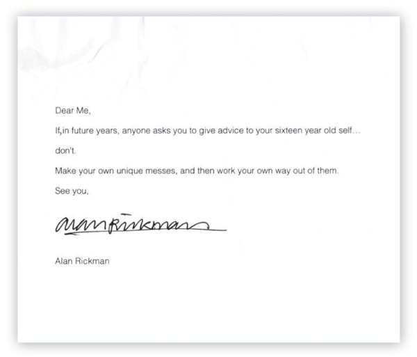It’s six years to the day since the death of Alan Rickman, a man known to most1 as Severus Snape in the Harry Potter films but whose finest, most iconic role was also his first: as the villain Hans Gruber in Die Hard, 34 long years ago. In 2011, he wrote the following letter of advice to his 16-year-old self. It featured in the book, Dear Me: More Letters to my Sixteen Year Old Self, edited by Joseph Galliano.