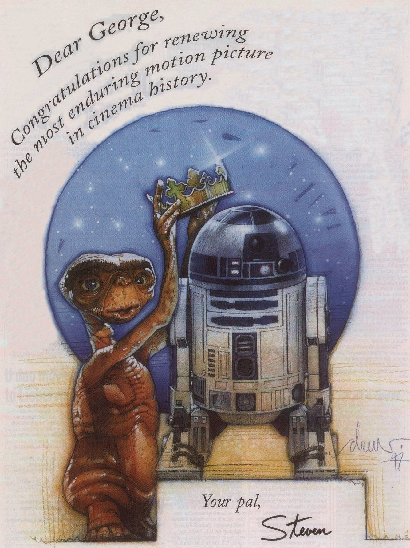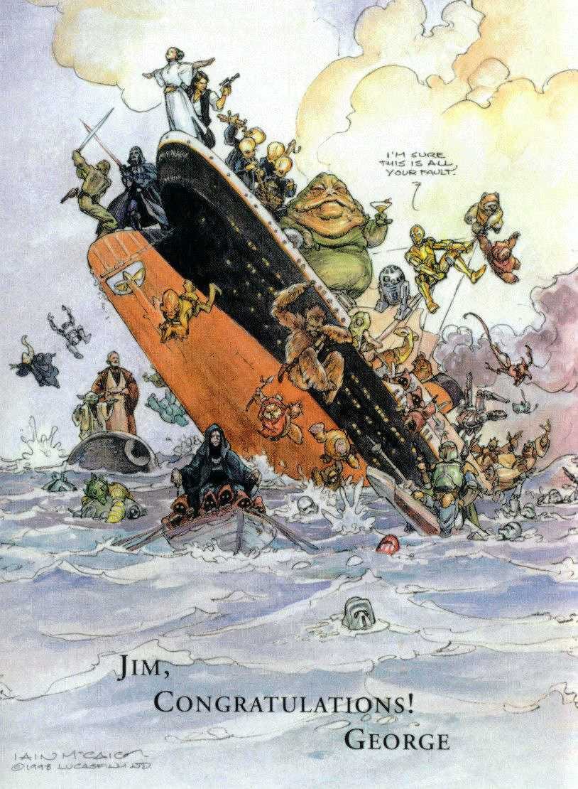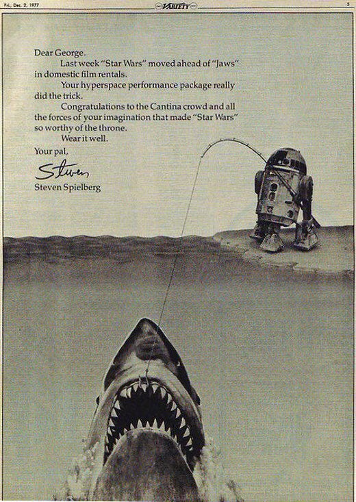 In 1977, when Star Wars took the “domestic film rentals” crown from Jaws, Steven Spielberg wrote a congratulatory letter to George Lucas and had it printed full page in Variety—a charming move, tastefully done, that kickstarted a tradition amongst filmmakers and studios that continues to this day. The result: whenever some kind of box office record is broken, the loser of the crown, be it a director or studio, publicly pats the victor on the back with a nice message. Spielberg’s was accompanied by an illustration of R2-D2 snagging Jaws on a fishing line; six years later, when E.T. broke Star Wars’ record, Lucas returned the favour with a letter of his own, published in the same paper, beneath a picture of E.T. being held aloft by Luke Skywalker and Han Solo. Spielberg and Lucas even signed them. As far as I can tell, these popped up in Variety four times, the final one arriving in 1998 when Titanic sank Star Wars, for which George Lucas wrote a letter of three whole words—two of which were names—to James Cameron, beneath an illustration of the Titanic surrounded by Star Wars characters as it plunged into the ocean.