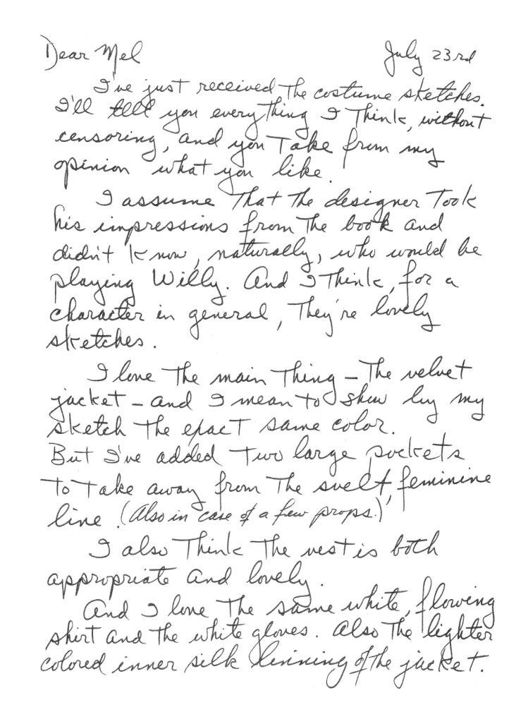 As we can see in the above clip, his request was granted, but thankfully his input didn’t stop there. Just one example: Soon after seeing some early sketches of Willy Wonka’s eccentric outfit, Wilder wrote the following letter to Stuart and offered some charmingly constructive feedback.
