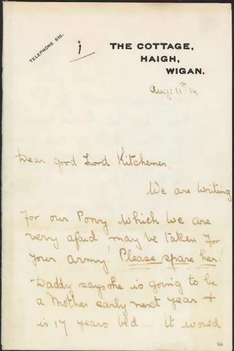 It was by no means just humans who were called up for service during World War I. In fact, over the course of the four year conflict, more than 16 million animals—including horses (for transport), dogs (for companionship and security), pigeons (to deliver messages), canaries (to detect gas), and cats (to catch rats in the trenches)—also went to war, a huge number made possible thanks to the inclusion of animals from private households, many across the UK. Unsurprisingly, not all citizens gave up their beloved pets without a fight. On 11th August 1914, two months after the war began, three distraught children from Wigan in England wrote to the Secretary of State for War, Field Marshal Herbert Kitchener, and begged him not to take their pony, a photo of which was included. To their astonishment, a reply soon arrived from Kitchener’s private secretary, who had a message to pass on.