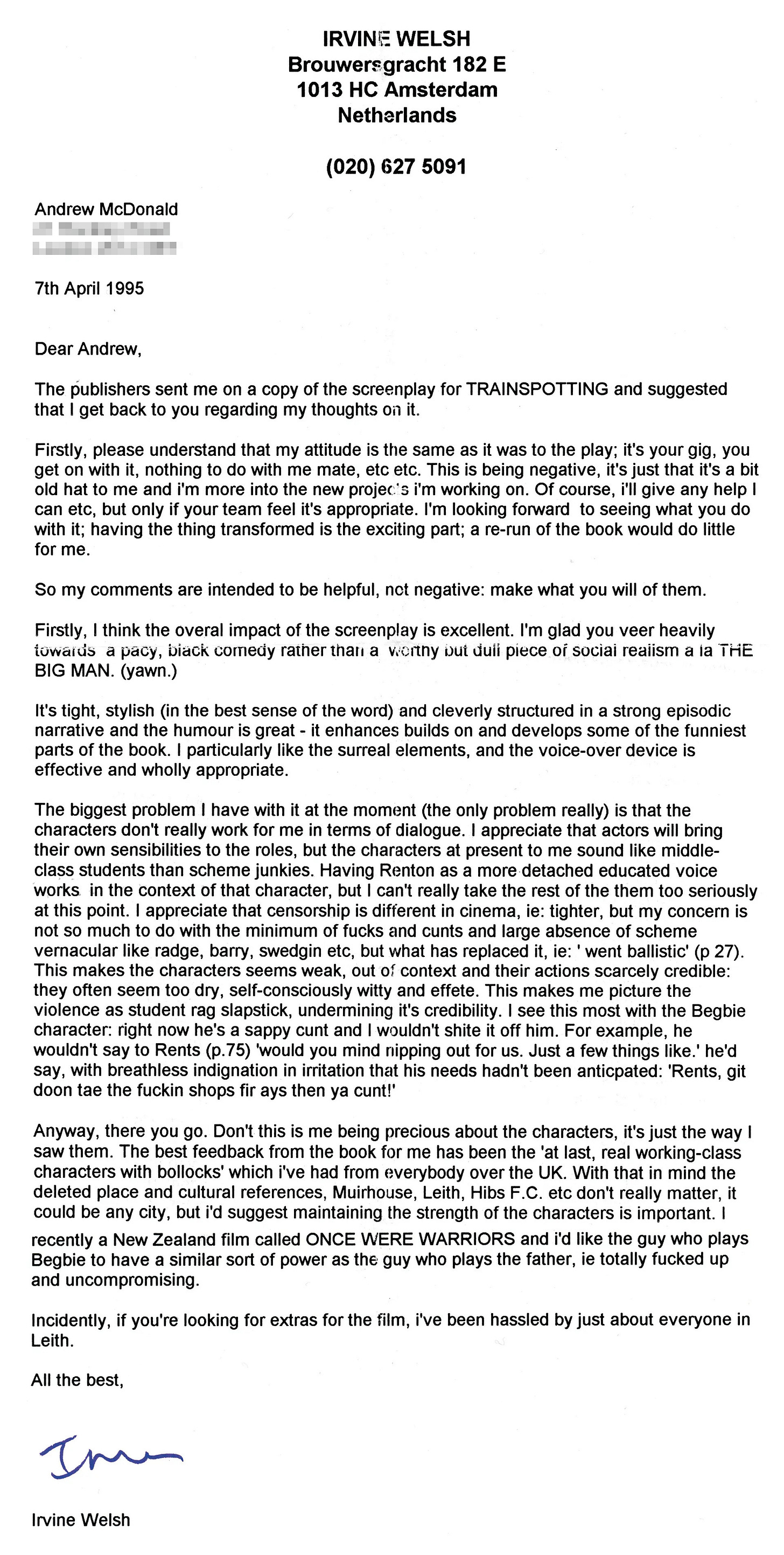 This letter can be found in the brilliant book, Trainspotting: The 25th Anniversary, by Jay Glennie, published by Coattail Publications.