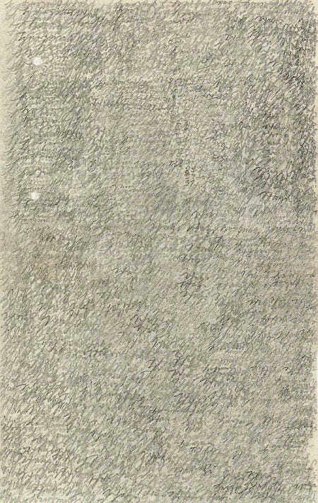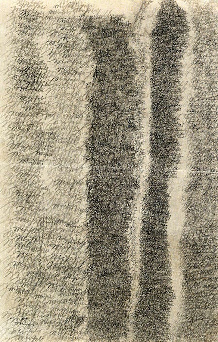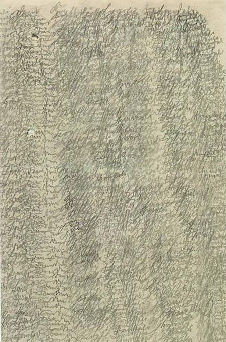 It was around this time that a heartbreaking collection of letters—including these three—were discovered in the archives of the Heidelberg hospital, all written obsessively in Emma's hand during her second stay at the clinic in 1909, at a time when reports indicate she was relentlessly speaking of her family. Each desperate letter is directed to her absent husband, Mark, and every page is thick with overlapping text. Some are so condensed as to be illegible; some read “Herzensschatzi komm” (“Sweetheart come”) over and over; others simply repeat the plea, “komm komm komm,” (“come come come”) thousands of times.