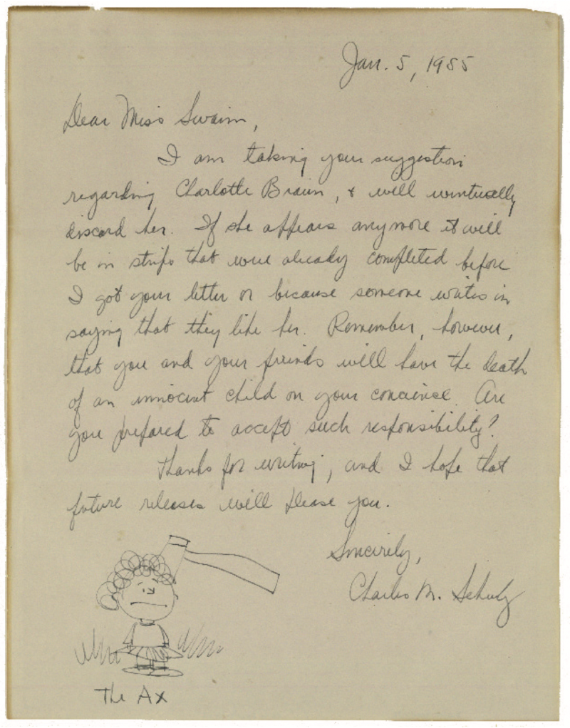 On November 30th 1954, a character by the name of Charlotte Braun made her debut in the much-loved, four-year-old comic strip Peanuts, and almost immediately pushed all the wrong buttons. Loud, brash and opinionated, “Good Ol’ Charlotte Braun” quickly irked Peanuts’ loyal readers and on February 1st 1955, after just ten sightings in the strip, she appeared in a storyline for the last time. Forty-five years later, following the death of Peanuts’ creator, Charles M. Schulz, a lady named Elizabeth Swaim donated to the United States Library of Congress this fascinating letter, written to her by Schulz in response to a complaint she had made about Braun just a month before the character’s demise. In it, Schulz agrees to kill the character off, reminds Swaim that she will be responsible for her death, and then signs off with a picture of Braun with an axe to the head.