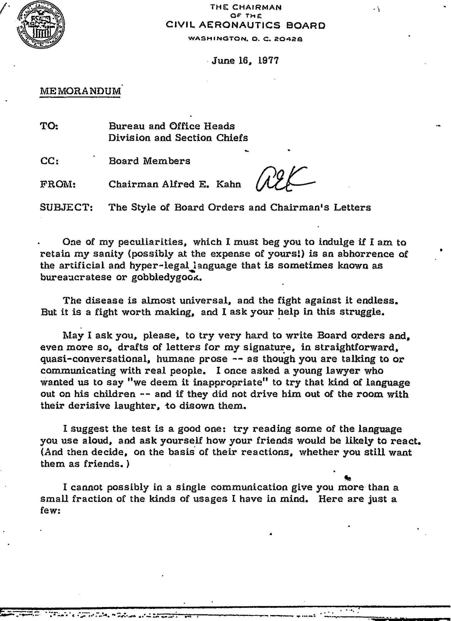 FROM: Chairman Alfred E. Kahn (Signed)SUBJECT: The Style of Board Orders and Chairman’s Letters