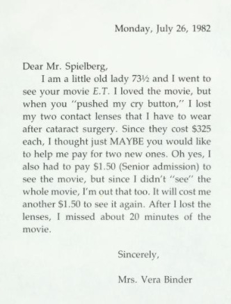 Above: A genuine letter of complaint to Steven Spielberg, as reprinted in the long out-of-print and unbearably charming book, Letters to E.T. I recommend tracking a copy down. You will cry—especially in the current climate.