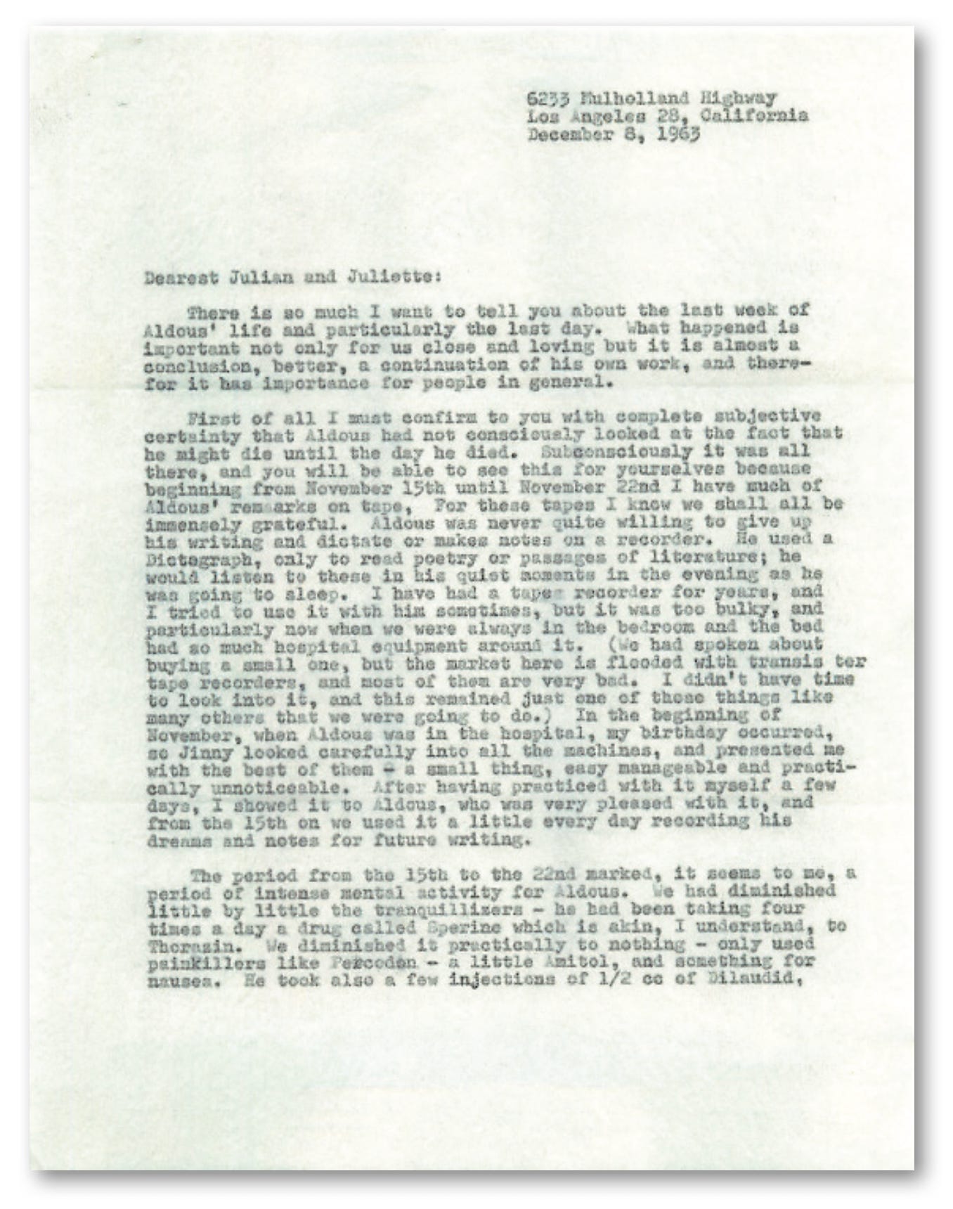 First of all I must confirm to you with complete subjective certainty that Aldous had not consciously looked at the fact that he might die until the day he died. Subconsciously it was all there, and you will be able to see this for yourselves because beginning from November 15th until November 22nd I have much of Aldous’ remarks on tape, For these tapes I know we shall all be immensely grateful. Aldous was never quite willing to give up his writing and dictate or makes notes on a recorder. He used a Dictograph, only to read poetry or passages of literature; he would listen to these in his quite moments in the evening as he was going to sleep. I have had a tape recorder for years, and I tried to use it with him sometimes, but it was too bulky, and particularly now when we were always in the bedroom and the bed had so much hospital equipment around it. (We had spoken about buying a small one, but the market here is flooded with transister tape recorders, and most of them are very bad. I didn’t have time to look into it, and this remained just one of those things like many others that we were going to do.) In the beginning of November, when Aldous was in the hospital, my birthday occurred, so Jinny looked carefully into all the machines, and presented me with the best of them – a small thing, easy manageable and practically unnoticeable. After having practiced with it myself a few days, I showed it to Aldous, who was very pleased with it, and from the 15th on we used it a little every day recording his dreams and notes for future writing.