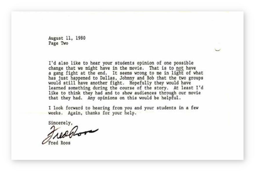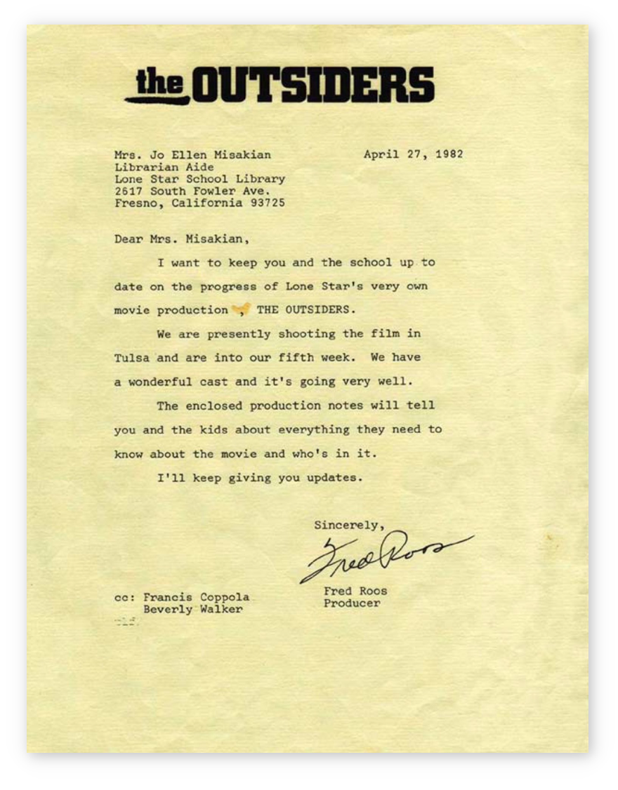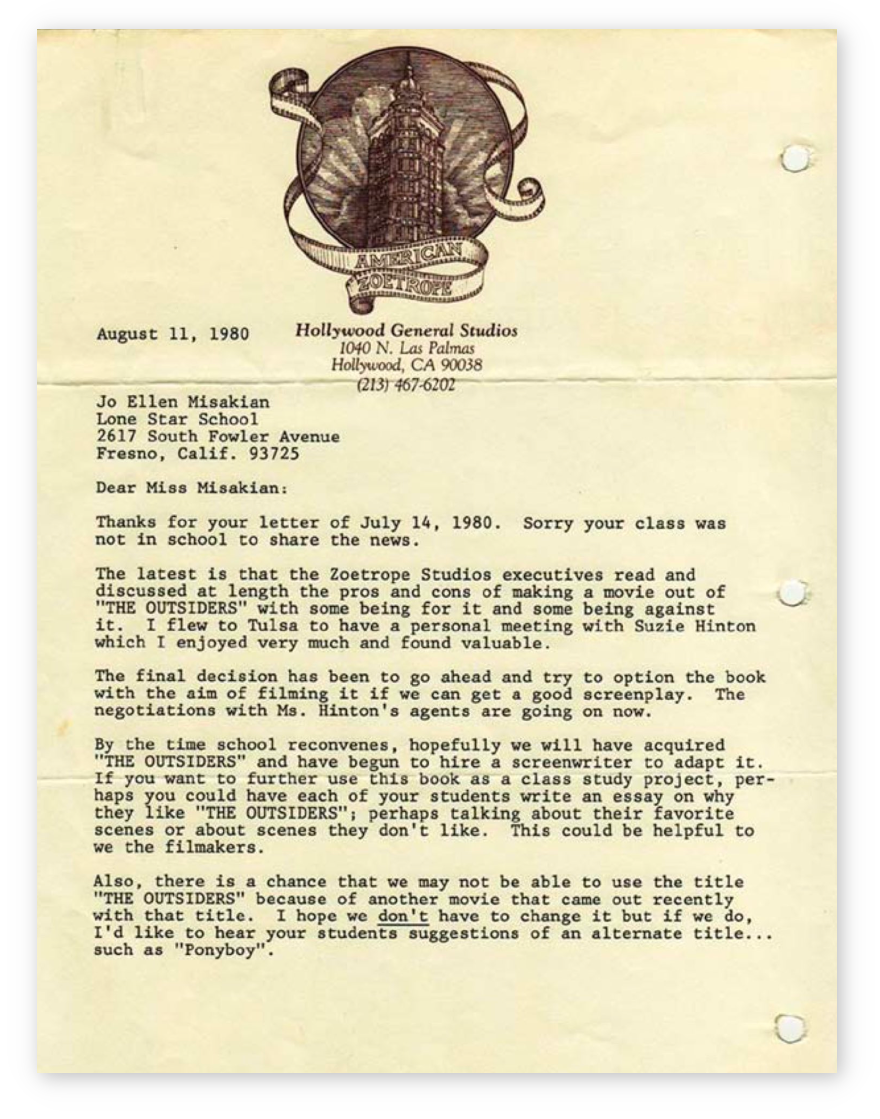 Thank you for sending us your letter, the petition from your students and the book “THE OUTSIDERS” by S.E. Hinton. Francis Ford Coppola received them and was very impressed with the passionate interest you and your students showed in this book.