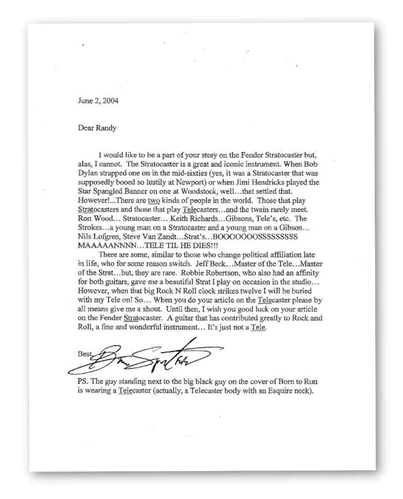 In 1950, Fender unveiled to the world the Telecaster, a versatile model of electric guitar that would go on to break ground in the world of music and become the guitar of choice for many of the instrument’s most recognisable and skilled aficionados. This was followed, four years later, by the Fender Stratocaster, a guitar with a tone and build that differed enough for guitarists of all abilities to pledge allegiance to one model or the other: an in-house rivalry of which there was only one guaranteed winner: Fender. In 2004, 50 years after the release of the younger sibling, as he prepared for a celebratory feature on the life of this legendary guitar, Los Angeles Times journalist Randy Lewis contacted Bruce Springsteen and asked if he would agree to an interview about the Stratocaster. Springsteen, who had played guitar since childhood, responded with the following letter, written on this day in 2004.