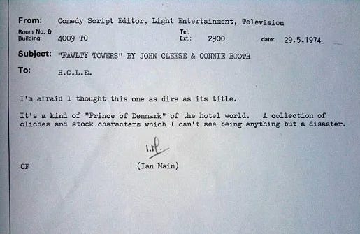 In May of 1974, after reading through a pilot script written by John Cleese and his then-wife, Connie Booth, a clearly unimpressed ‘comedy script editor’ by the name of Ian Main sent the following memo to BBC Television‘s Head of Comedy and Light Entertainment. Luckily for the general population, and thanks in no small part to the persistence of Cleese and Booth, Main’s opinion was ultimately ignored by his superiors and a year later the script had evolved into a programme which to this day is considered one of the funniest ever to grace our screens. The show was Fawlty Towers.