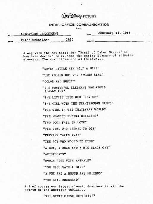 When, in early-1986, Disney executives decided to change the title of their upcoming animated feature from ‘Basil of Baker Street’ to the less ambiguous ‘The Great Mouse Detective’, its production team were less than pleased. One animator in particular, Ed Gombert, harnessed his displeasure to comical effect by creating, and circulating, the following: a fake memo purportedly from then-head of department, Peter Schneider, in which he announced the retroactive renaming of Disney’s entire back catalogue, bar The Aristocats, in a similarly bland style.