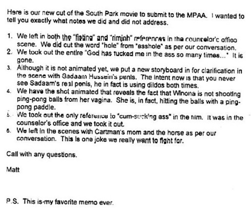 Ever since it first aired on television in 1997, Matt Stone and Trey Parker’s hugely popular animated comedy, South Park, has courted controversy due to its crude jokes, deliberate lack of tact, and the creators’ steadfast refusal to self-censor or bow to external pressures. However, two years after the show debuted, a feature length film was released—South Park: Bigger, Longer & Uncut—and in order for it to gain an R rating, Stone and Parker had no choice but to chop and change certain scenes. This memo, from Stone to the MPAA, was sent along with the movie’s second cut.