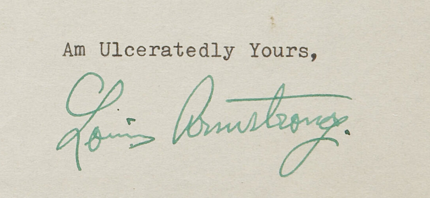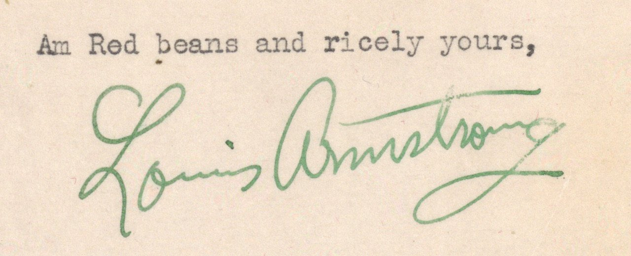 With thanks to The Mitchell Collection, Heritage Auctions, The Historic New Orleans Collection. Many of these sign-offs can be found closing letters in Louis Armstrong, in His Own Words: Selected Writings, which is highly recommended.