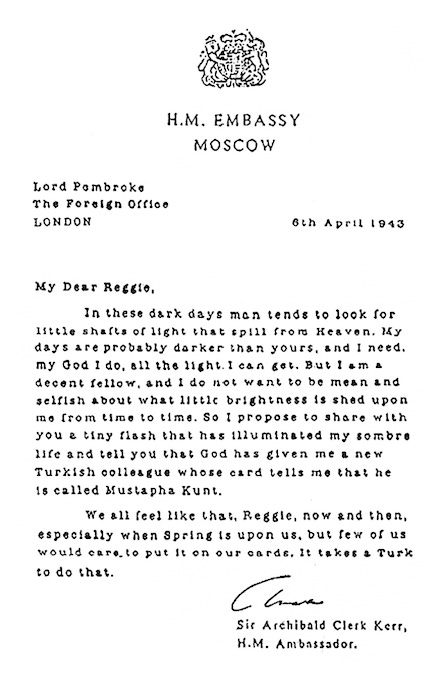 At the height of World War II on April 6th 1943, at which point he was British Ambassador to Moscow, the famously eccentric Sir Archibald Clark Kerr wrote the following letter1 to Foreign Office minister Lord Reginald Pembroke. This now classic piece of correspondence, which was prompted by a Turkish diplomat with the most unfortunate of names, is indeed hilarious; it also offers proof, if it were needed, that name-based punnery and mild xenophobia did a roaring trade long before the internet was fired up.