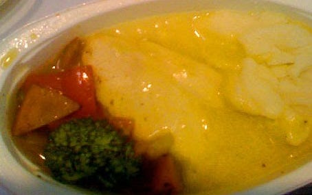 Now, I know what you’re thinking. You’re thinking it’s more of that Bhaji custard. I admit I thought the same too, but no. It’s mustard, Richard. MUSTARD. More mustard than any person could consume in a month. On the left we have a piece of broccoli and some peppers in a brown glue-like oil and on the right the chef had prepared some mashed potato. The potato masher had obviously broken and so it was decided the next best thing would be to pass the potatoes through the digestive tract of a bird. Once regurgitated it was clearly then blended and mixed with a bit of mustard. Everybody likes a bit of mustard, Richard.
