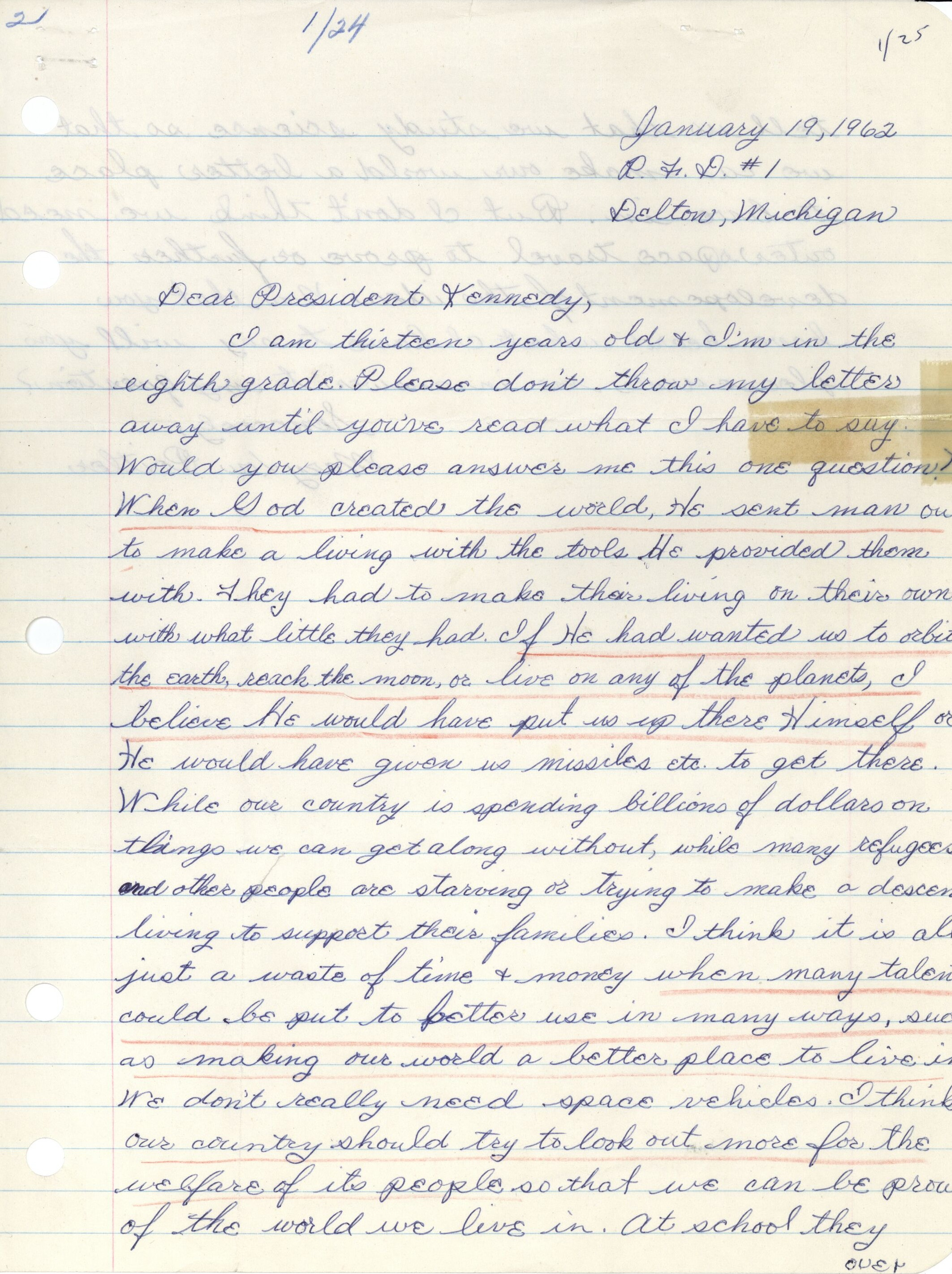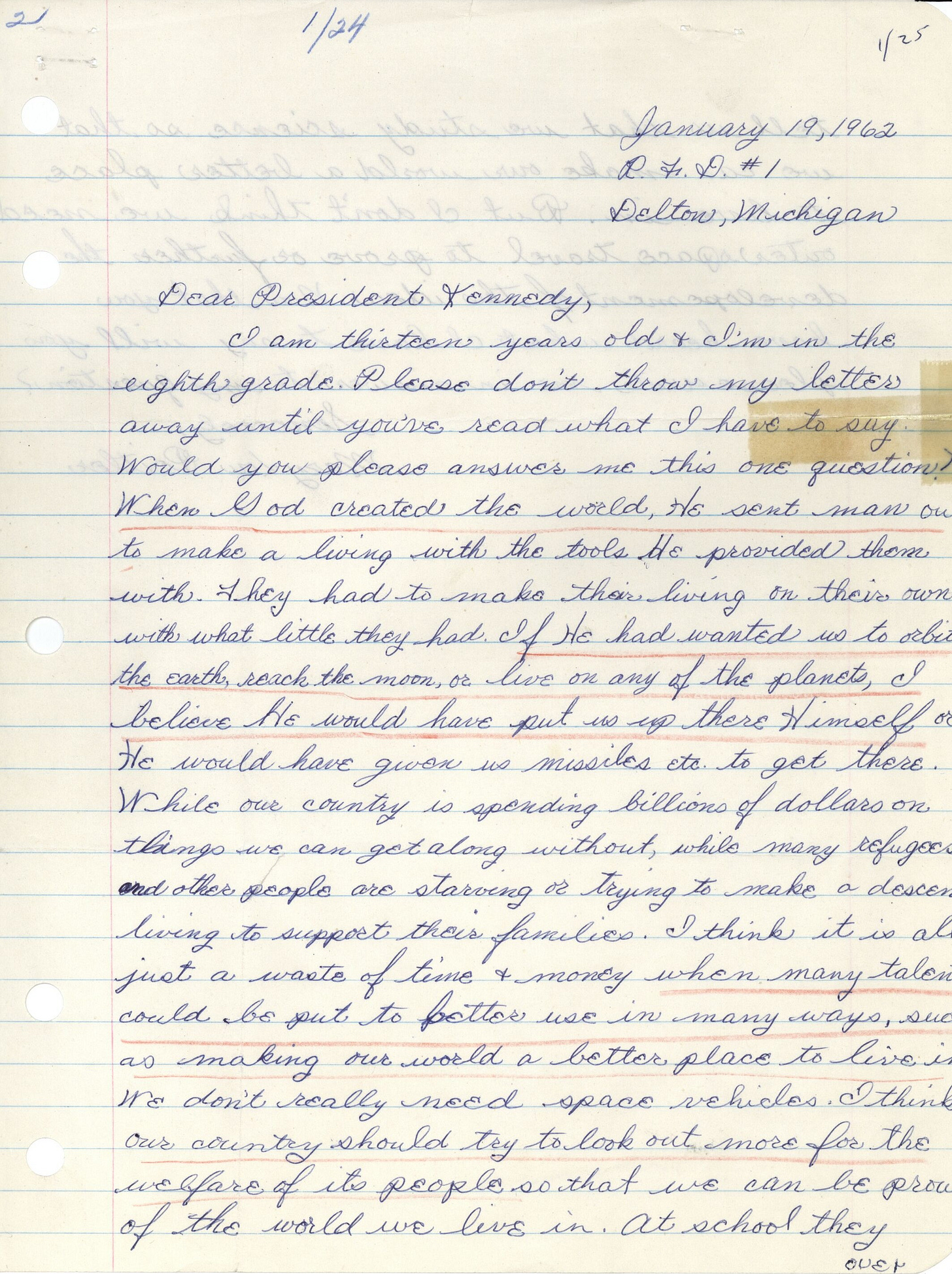 I am thirteen years old and I’m in the eighth grade. Please don’t throw my letter away until you’ve read what I have to say. Would you please answer me this one question? When God created the world, He sent man out to make a living with the tools he provided them with. They had to make their living on their own with what little they had. If he had wanted us to orbit the earth, reach the moon, or live on any of the planets, I believe he would have put us up there himself or he would have given us missiles etc… to get there. While our country is spending billions of dollars on things we can get along without, many refugees and other people are starving or trying to make a decent living to support their families. I think it is all just a waste of time and money when talents could be put to better use in many ways, such as making our world a better place to live in. We don’t really need space vehicles. I think our country should try to look out more for the welfare of its people so that we can be proud of the world be live in. At school they tell us that we study Science so that we can make our world a better place to live in. But I don’t think we need outerspace travel to prove or further the development of this idea. Now that you have heard what I have to say, will you please write an answer to my question?