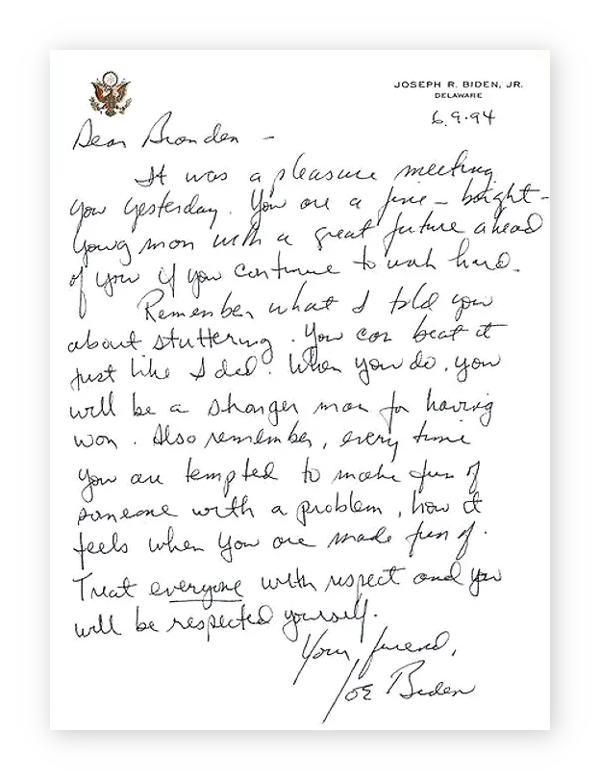 On September 5th of 1994, an 8th-grade student named Branden Brooks nervously raised his hand during the Q&A session of a presentation by then-Senator Joe Biden. After the event, having noticed the teenager’s stutter as he asked his question, Biden pulled him to one side: