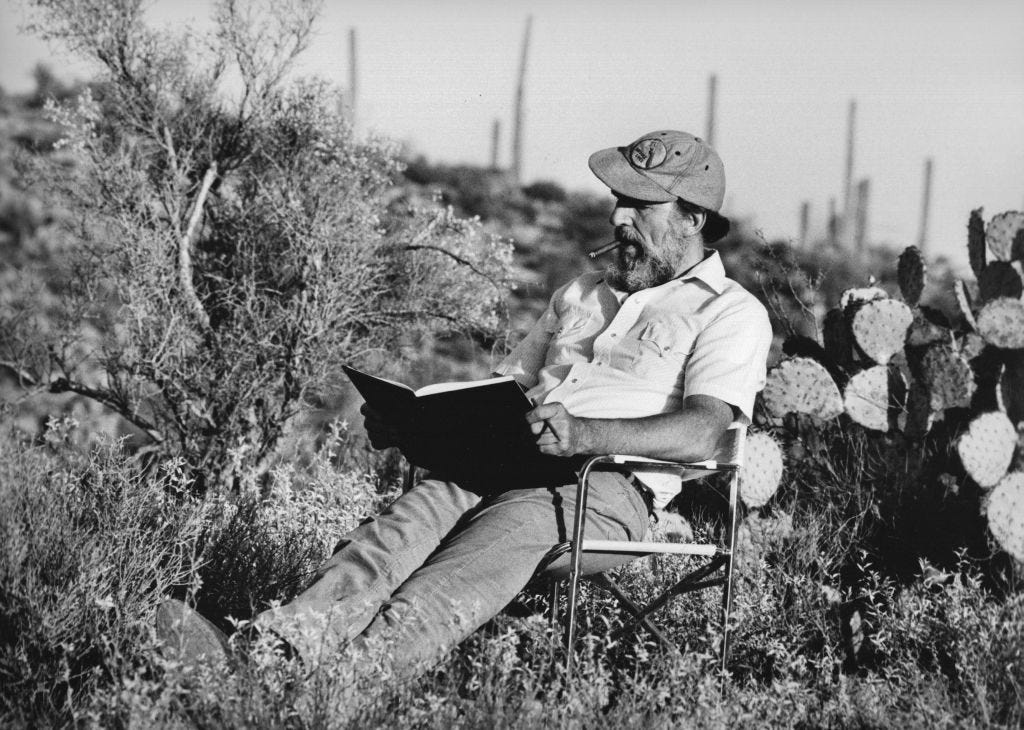 American author and environmentalist Edward Abbey sits in a folding chair as he reads, near his desert home, Tuscon, Arizona, April 9, 1984. (Photo by Ed Lallo/Getty Images)